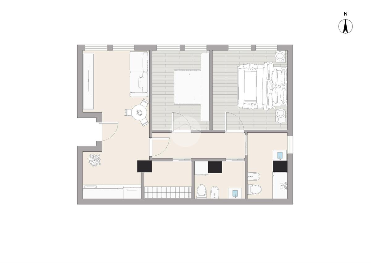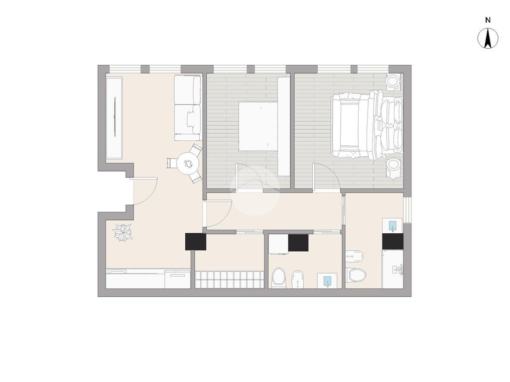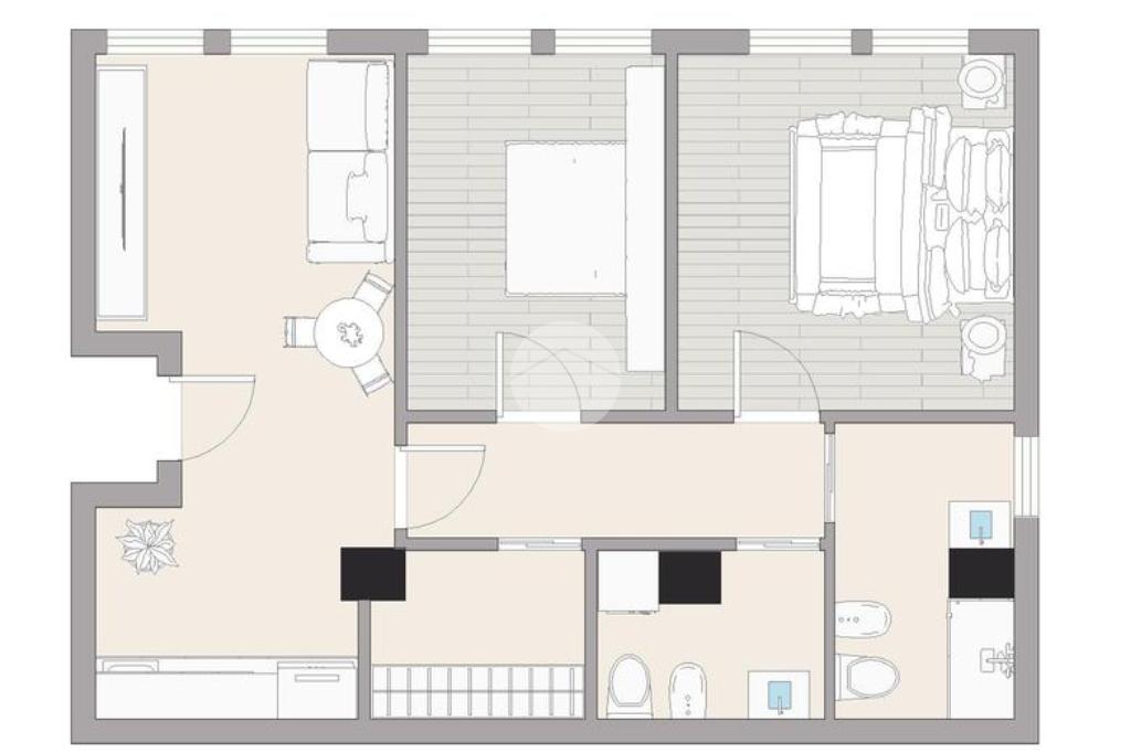 L'immobile in condivisione è composto da: ingresso in un open space, disimpegno, un ripostiglio, due camere e due bagni.