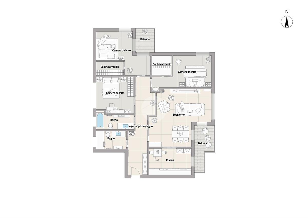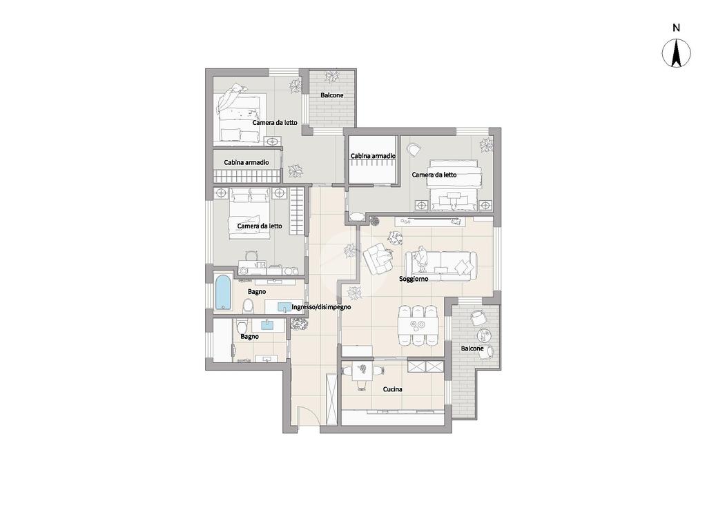 L'appartamento è composto ingresso, cucina semiabitabile, soggiorno, tre camere da letto, due bagni finestrati, due balconi, due cabine armadio.