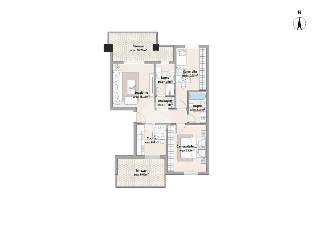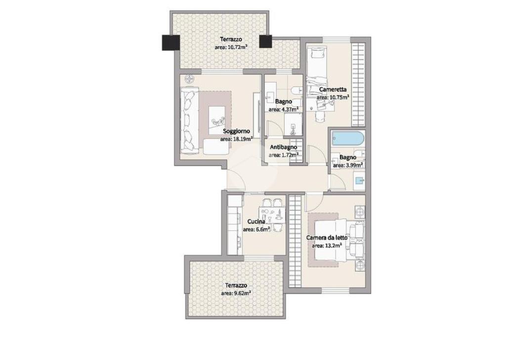 L'appartamento, situato al secondo piano di un condominio con servizio di portineria, si compone di ingresso, soggiorno, cucina abitabile, due camere da letto, doppi servizi e due terrazzi.