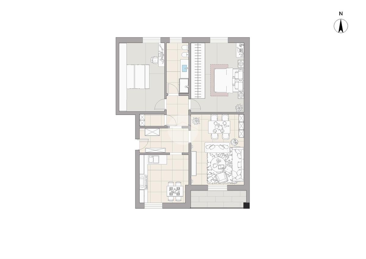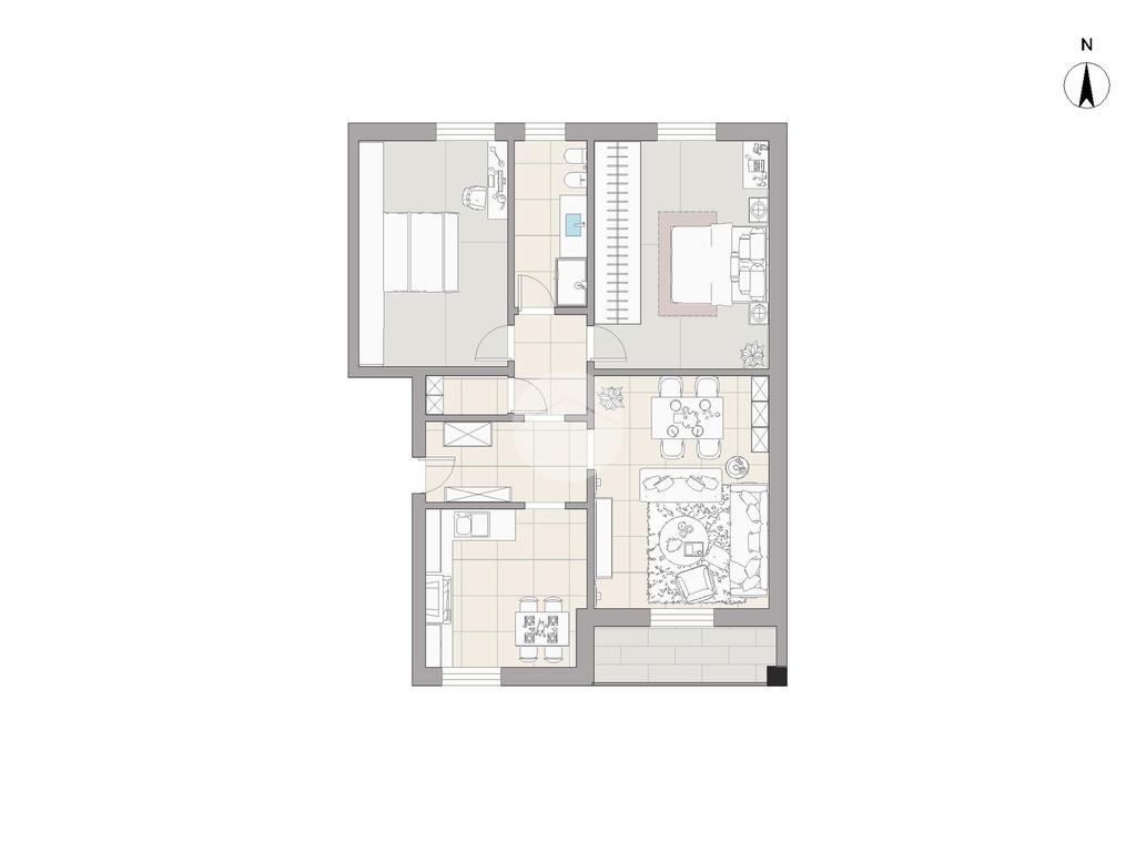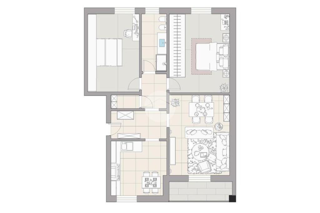 L'appartamento è composto da: ingresso, soggiorno, cucina, due camere da letto, ripostiglio e bagno.