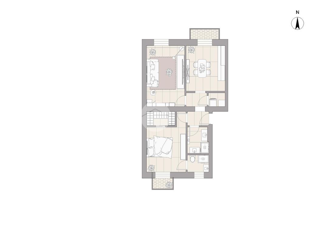 La soluzione è così composta: ingresso in disimpegno, open space cucina - soggiorno, due camere da letto, doppi servizi e ripostiglio.