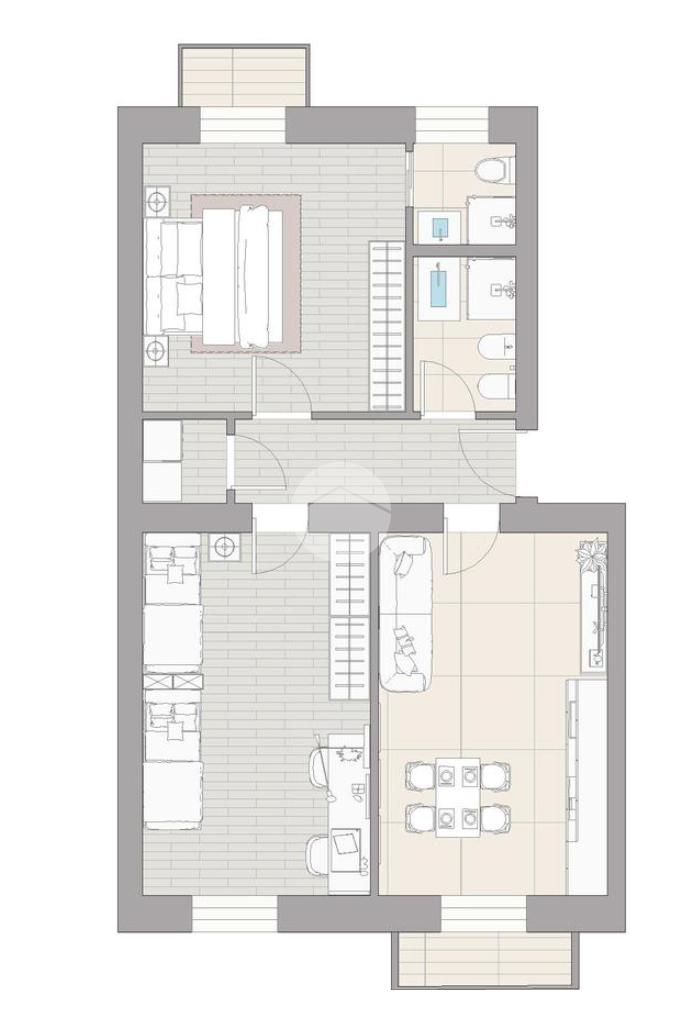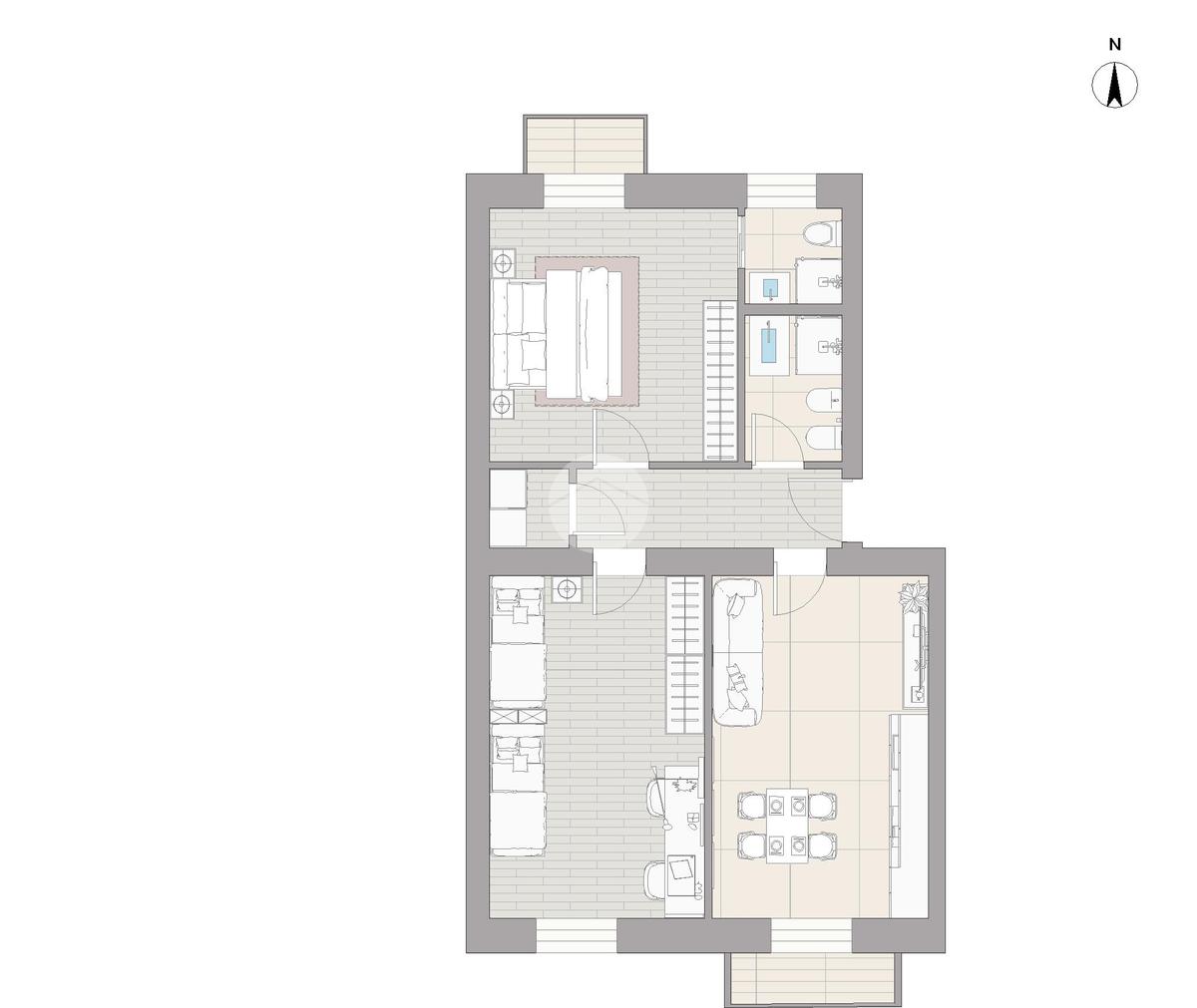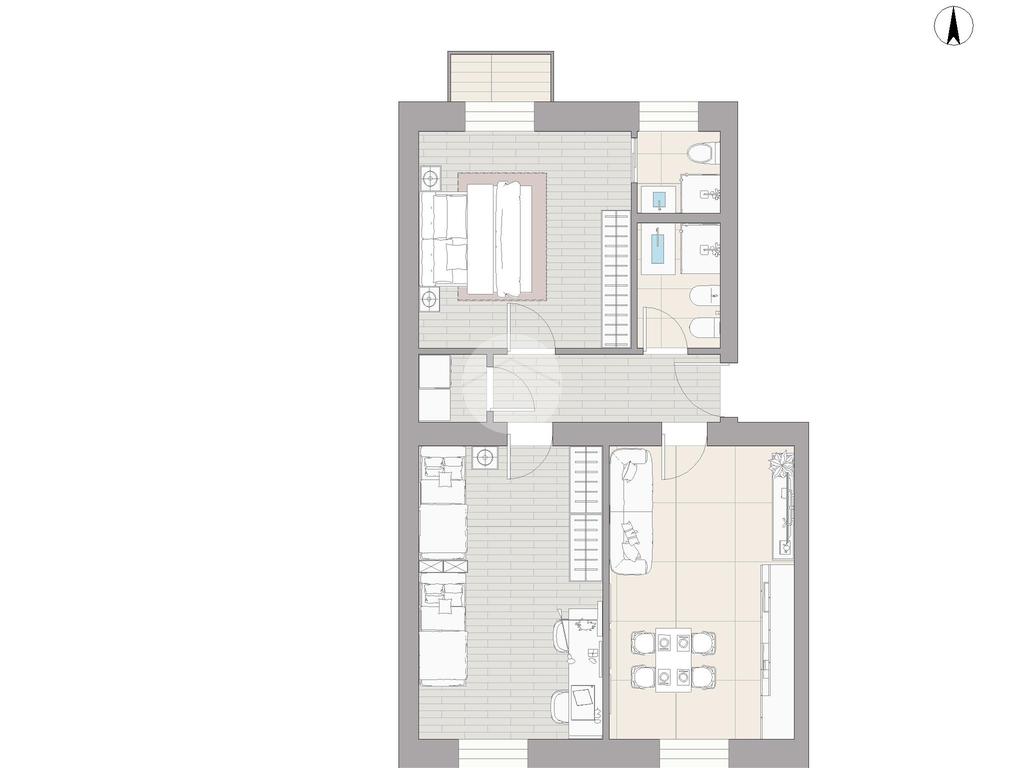 La soluzione è così composta: ingresso in disimpegno, open space cucina - soggiorno, due camere da letto, doppi servizi e ripostiglio.
