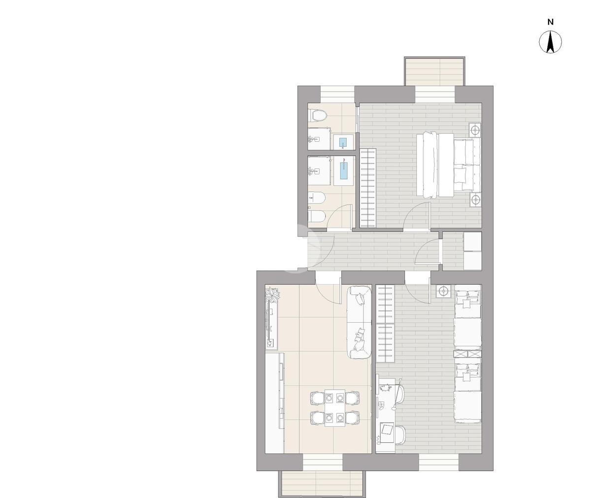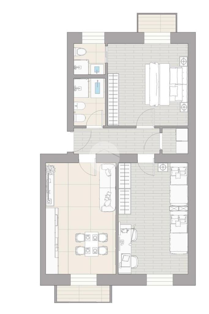 La soluzione è così composta: ingresso in disimpegno, open space cucina - soggiorno, due camere da letto, doppi servizi e ripostiglio.